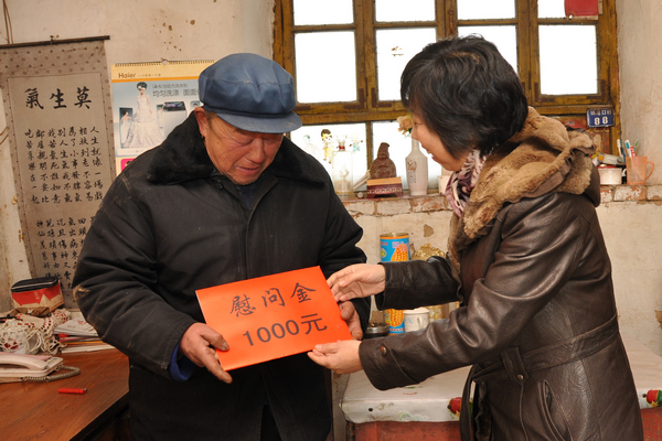 “快过年了,代表学校来看看您,您为国家做贡献了啊,”在87岁的参加过抗日战争、解放战争和抗美援朝的孤寡老人李魁忠家里,张潍华把一千元的慰问金递到老人手中,老人发自肺腑地说:“感谢国家,感谢党,日子越过越好。”