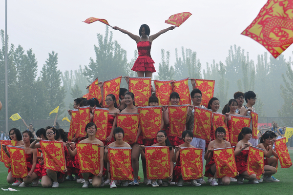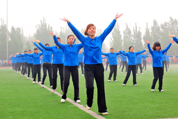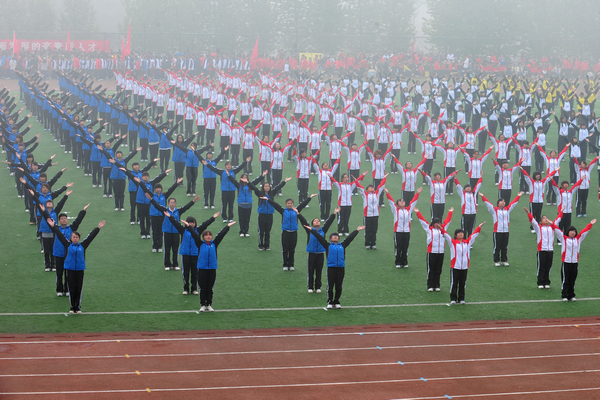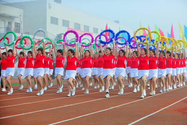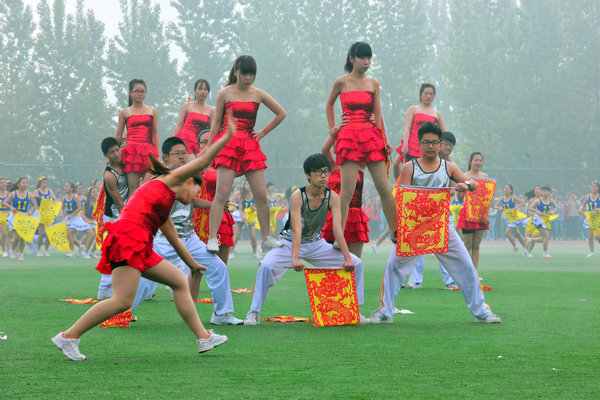 之后,第九套广播体操、教工“最炫民族风”广场舞和学生健美操等大型团体操表演,拉动了全场气氛。