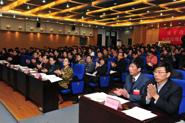 上午,第一次全体会议在浮烟山校区图书馆演播厅召开。校领导石增立、马安宁、秦玉明、张潍华、孙宏伟、朱军、井西学、葛国文和大会主席团其他成员在主席台就座。会议由大会主席团副主席、秘书长,校党委副书记张潍华主持。大会主席团副主席,校党委副书记、校长马安宁向大会作了题为《深化改革 加快发展 大力推进应用型人才培养特色名校建设》的工作报告。财务处处长王培承作了财务工作报告,总务处副处长赵世军对浮烟山校区绿化硬化规划设计方案进行了说明,提案工作委员会主任、学校办公室主任刘军作了提案办理情况报告。会议还提交了工会工作报告和工会经费审查工作报告。