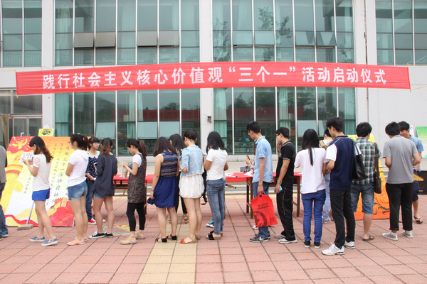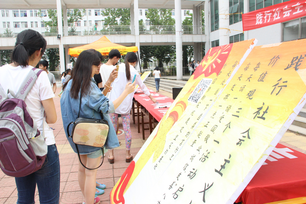 活动现场宣读了开展“践行社会主义核心价值观‘三个一’活动”倡议书。同学们在了解了活动的目的、内容后,踊跃参与,争先恐后在写有“爱国 敬业 诚信 友善”的签名横幅上写下自己的名字,表示要将践行社会主义核心价值观落实到学习和生活中。在现场倡导的同时,还启动了线上参与活动,通过“青春潍医”公众微信平台,800余名学生以网络签名的方式参与到活动中来。