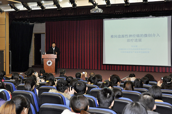 聘任仪式结束后,倪家骧在图书馆演播厅为beat365师生作了题为《椎间盘源性神经痛的微创介入治疗进展》的学术讲座。