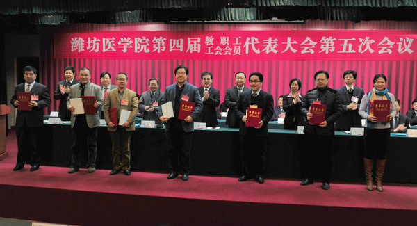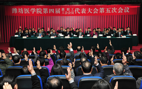 1月24日,潍坊医学院第四届教职工代表大会暨工会会员代表大会第五次会议隆重召开。会议听取、审议了关于校长工作报告、学校财务工作报告、工会工作报告和工会经费审查报告,并表决通过了报告的决议,会议讨论了《潍坊医学院章程(草案)》和《潍坊医学院关于加快推进应用型人才培养特色名校重点建设的意见(征求意见稿)》。