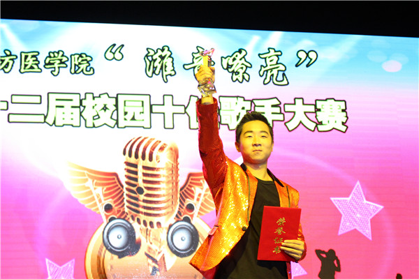 “多少人曾在你生命中来了又还,可知一生有你我都陪在你身边……”在12位歌手的动情歌声带领下,第十二届“潍音嘹亮”校园十佳歌手大赛在情景交融的千人大合唱中缓缓落下帷幕,基础医学院2013级王博文和麻醉学系王炳琪获得本届校园歌王。