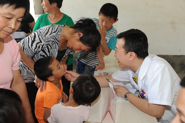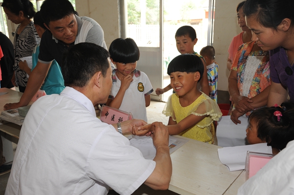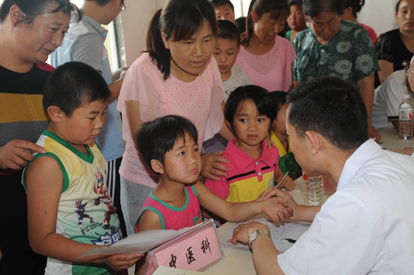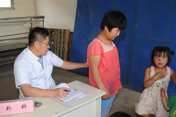 31日早晨5:30分,医疗团队的住处,已经热闹起来。简单的早饭后,大家就奔赴宋范村和土屋村。小孩子排在前,老年人紧随其后,秩序井然。排长队候诊的村民听出了医生们的声音都有些嘶哑,看出了他们烈日酷暑下仍全然不顾惜自己的状态,都很感动。