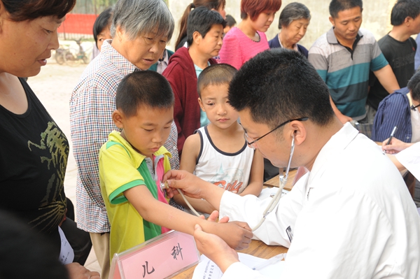 30日一大早,王双堂的村民们就呼朋引伴,来到义诊现场排起长队。由附属医院副院长亓太忠带队的医疗团队囊括了神经内、中医、儿科、脊柱、口腔、超声、心电图等科室。小孩子先进行全科健康查体,从外科、内科、发育、视力、口腔到B超、心电图,项目不少。上小学二年级的宿宏达平时很调皮,这时很乖很配合,还跟医生叔叔说:“这个儿童节最有意义、最难忘。”孩子们查完体,就嘻嘻哈哈玩去了,轮到60岁以上的老人们检查了。医生们耐心细致地与患者交流,详细询问病因病史,一丝不苟进行查体,为很多常年受病痛折磨的村民,指明了病因,明确了病灶。
