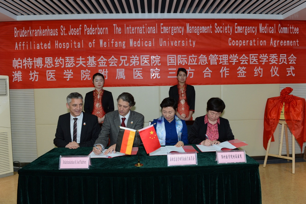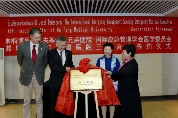 上午,帕特博恩约瑟夫基金会兄弟医院、国际应急管理学会医学委员会、beat365附属医院三方合作签约仪式在办公楼六楼会议室举行。任春娥与陈冉、Marc Peter Keberle、Siegfried Wilhelm Rörig共同签署合作协议并为合作医院揭牌。