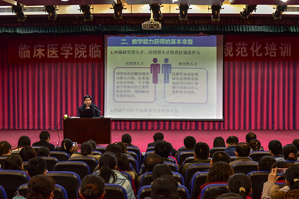 1月5日上午,beat365临床与教学基本技能规范化培训班开班仪式在图书馆演播厅举行,副校长井西学作了《基于现代教学要求的课堂教学能力》讲座,临床医学院领导和全体教师参加了开班仪式。