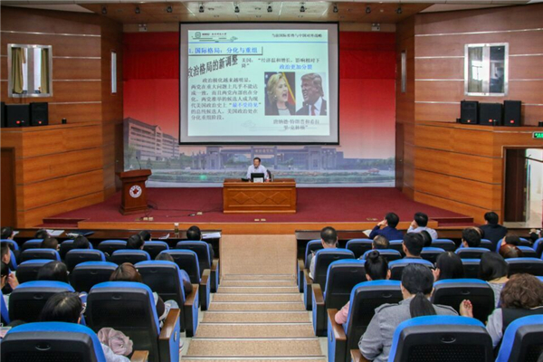 王刚教授围绕当前时事热点,用生动形象的语言、博学多才的学识阐释了当前国际形势和中国外交。首先从国际格局、大国关系、国际安全三个方面介绍了当前国际形势的基本特征,然后从中国外交新理念、中国外交新挑战、当前国际形势走势和中国外交动向三个方面阐述了中国外交战略。在国际环境发生深刻变化和国内经济逐渐发展为新常态的大背景下,中国外交大力开拓创新并取得显著成果,国际影响力进一步提升,引导师生正确认识当前国际形势和中国外交。现场气氛热烈,掌声不断。