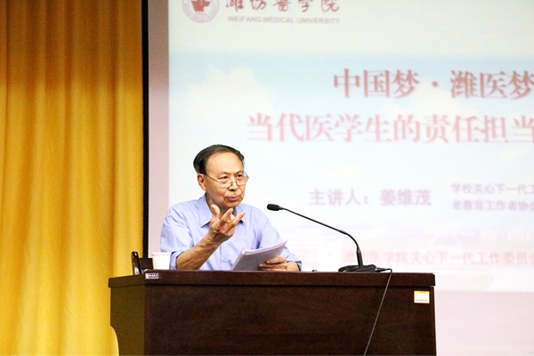 5月23日下午,由学校关心下一代工作委员会举办的“中国梦 潍医梦,当代医学生的使命责任和担当”主题报告会在图书馆演播厅举行。报告由学校关心下一代工作委员会副主任、老教育工作者协会会长姜维茂教授主讲。