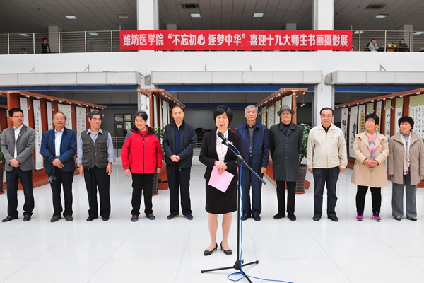 张潍华在致辞中指出,在党的十九大即将胜利召开之际,学校关工委精心筹划本次书画摄影展,老干部、老同志与青年学子们同挥毫,搭建了老干部与青年学生深入交流的平台。一幅幅作品构思精巧、创作精心,弘扬主旋律、充满正能量,充分表达了对党、对祖国的深厚感情和迎接党的十九大召开的喜悦心情。希望大家不忘初心,继续前进,努力创作出更多弘扬社会主义核心价值观、体现中华文化精神的优秀作品。