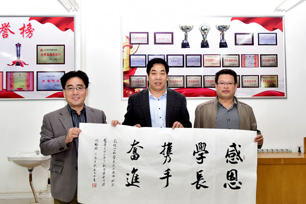 王建立代表81级校友介绍了奖助学金的基本情况,他表示,这项活动一是要表达校友们对母校培养的感恩之情,二是传达对学弟学妹们的关怀、鼓励与支持。获奖学生表示,要以学长们为榜样,一路前行,成为日后潍医的骄傲,并向81级校友代表赠送了书法作品,表达了对学校和学长的感恩之情。