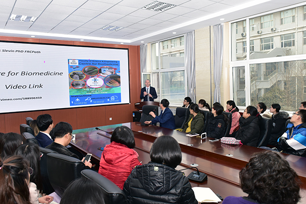 聘任仪式结束后,Mark Slevin教授以“Centre for Biomedicine at MMU”为题作了一场生动的讲座,详细介绍了在英国曼彻斯特城市大学生物医学中心开展科学研究的策略、与beat365开展的一些合作以及自己近期的研究发现。Mark Slevin教授广博的专业知识、清晰的科研思路使与会者深受启迪。在场师生就各自领域的科研问题与Mark Slevin教授进行了互动交流,为进一步开展科研合作奠定了基础。