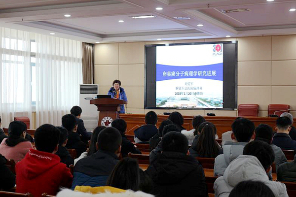 刘爱军以《卵巢癌病理学研究进展》为题作了一场精彩的学术讲座,着重从卵巢癌的分型、卵巢癌的起源和分子发病机制、遗传性卵巢癌的特点三个方面进行了深入浅出、详细生动的讲解,并对与会师生提出的问题进行了细致的解答。医学检验学院师生、临床病理系教师、附属医院、潍坊市人民医院、潍坊市中医院、潍坊市妇幼保健院病理科医生约100余人参加了报告会。