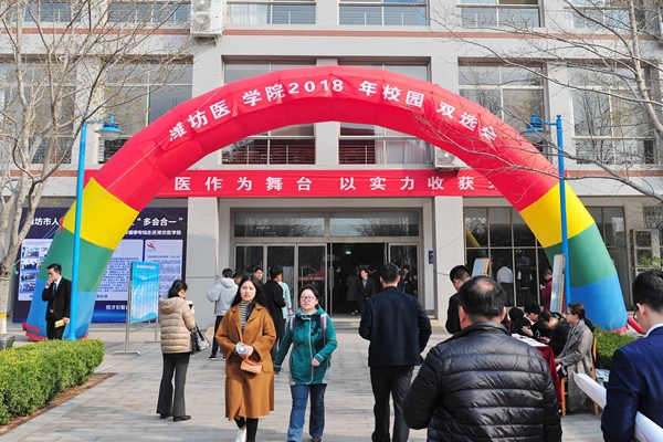 3月24日一早,春意盎然的潍医校园里热闹非凡。迎着熹微的晨光,潍坊医学院2018届毕业生春季校园双选会在浮烟山校区拉开了帷幕。校长管英俊、副校长朱军到现场调研。潍坊市大中专毕业生就业指导中心、 潍坊市大学生创新创业管理服务中心主任王术平到现场宣讲就业政策。