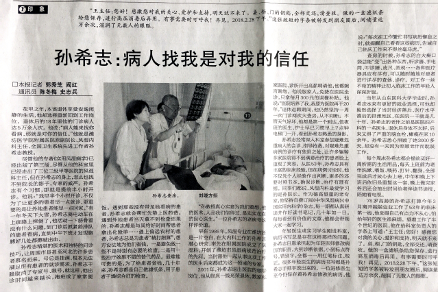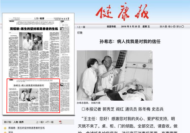 5月25日,《健康报》第7版“人物·视界”刊登《孙希志:病人找我是对我的信任》一文(作者:陈冬梅 史志兵),这是继灯塔-党建在线、《山东工人报》后,媒体再次报道beat365老专家、全国卫生系统先进工作者孙希志教授,从医53载妙手回春无数,退休18年依然一线坚守的感人事迹。