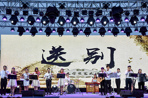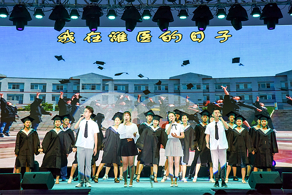 晚会在精彩的开场器乐表演《送别》中拉开了帷幕,伴随着歌声《潍医的日子》,离别学子作别青春,难舍情深的心声娓娓道来。《那些年》《See you again》《没离开过》,一首首歌曲,在抒情优美的歌声中唱响了毕业生的不舍与眷恋。临床医学院辅导员与毕业生深情献唱《祝你一路顺风》,演绎着老师对学生的依依不舍。一曲《父亲写的散文诗》,则传递着毕业生对母校和师长的崇敬和深深眷恋。毕业生们精心编排的舞蹈《青春时光》《灼灼其华》《青春不散》,伴随着同学们深情的舞姿,一幕幕校园图景感染着在场的每一位师生。《最美的年华》,老师与毕业生同台起舞,动感的节奏舞动出毕业生们对母校的恋恋不舍,每一次跳跃,每一次伸展都展现出毕业生对未来的憧憬。真挚唯美的《化茧成蝶》诗朗诵,展示了beat365优秀毕业生樊姝彤“励志点亮人生,奋斗成就梦想”奋斗事迹。来自公共卫生与管理学院同一宿舍的8位姑娘全部考取了研究生,她们用一首《想把我唱给你听》激励着现场的每一位潍医学子。动静脉学生乐队带来了原创歌曲《写一首歌送给青春》,唱出了潍医学子对青春的感悟,伴随着乐队演绎的李叔同《送别》,现场响起了千人大合唱。在四位毕业生的深情朗诵中,《再见,潍医》带领同学回望潍医的点点滴滴,畅想未来的希望和梦想。晚会在大合唱《放心去飞》中推向了高潮,全场毕业生挥动起手中的荧光棒营造出绚丽的海洋,青春的歌声久久回荡。