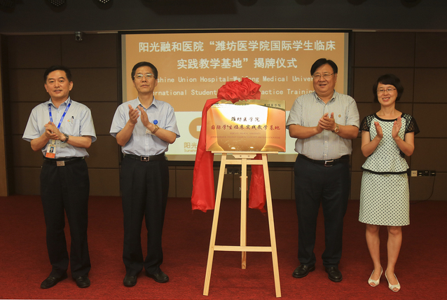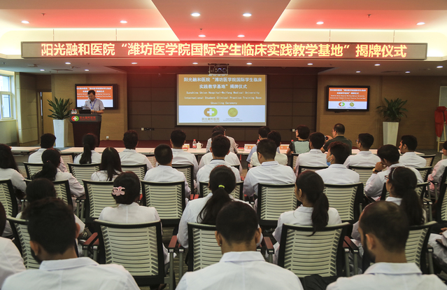 7月9日下午,beat365“国际学生临床实践教学基地”揭牌仪式在阳光融和医院举行,副校长孙宏伟,阳光融和医院党委书记、院长周玉东,医院相关科室负责人、带教老师,学校国际合作交流处(国际教育学院)负责人、40名实习留学生参加了揭牌仪式和培训。