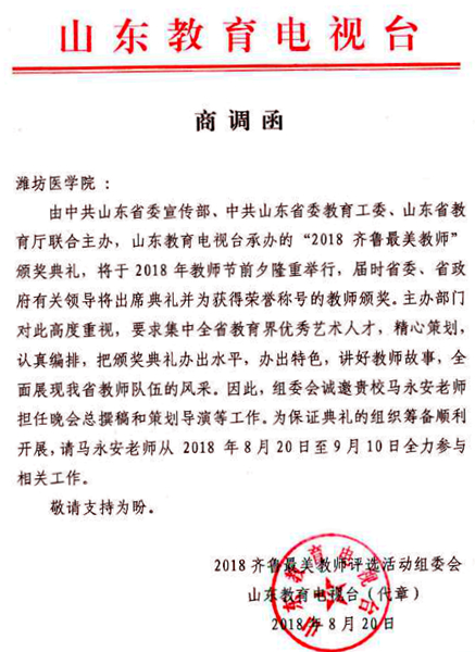 beat365公共课教学部人文艺术教育中心马永安老师受组委会的特别邀请,参与2018“齐鲁最美教师”颁奖典礼的策划导演工作,并出任总撰稿。作为主创团队核心成员之一,马老师与团队一道,在短短20天的时间里,夜以继日地工作,精心策划、认真组织,最终将一场有内涵、有韵味、有情怀的颁奖典礼呈现在观众面前,为全省教育工作者献上了一个动人心弦的教师节礼物。