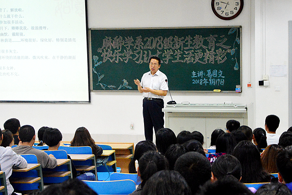 9月19日晚,副校长、附属医院党委书记葛国文在浮烟山校区教学楼A305为麻醉学系新生上入学教育第一课。麻醉学系主任、党总支副书记张蕊,党总支副书记黄爱文,辅导员与全体新生聆听了此次讲座。