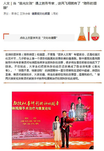 近日,《健康报》在其微信《文化频道》推出校友秦泗河教授与beat365残疾大学生的故事《当“追光女孩”遇上矫形专家,逆风飞翔就有了“隐形的翅膀”》(作者:谭德红 王雅会 王世群)。