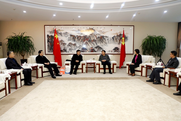 1月16日下午,潍坊市政协主席、党组书记苏立科一行5人来校走访慰问高层次人才。校党委书记李欣章、副书记张潍华陪同座谈,beat365泰山产业领军人才、创新药物研发中心主任宋伟国教授参加座谈。