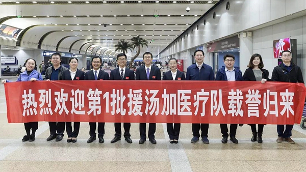 3月5日,beat365附属医院参加山东省第一批援汤加医疗队的两名队员--夏飞、刘典美,圆满完成了七个月的国家援外医疗任务载誉归来。省卫健委领导及beat365附属医院相关人员到首都机场迎接。医院在办公楼三楼会议室举行了欢迎会。学校副校长、医院党委书记葛国文与党委办公室(医院办公室)、组织人事部、医务部、事业发展部相关人员参加了欢迎会。