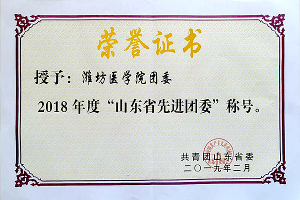 2018年,在学校党委和团省委的坚强领导下,学校共青团以习近平新时代中国特色社会主义思想为指导,紧紧围绕学校中心工作,主动创新,积极作为,在思想引领、校园文化、创新创业、志愿服务、社会实践、团组织建设与共青团改革等工作领域取得了新突破。制定并推进实施《潍坊医学院共青团改革实施方案》,完善“一心双环”团学组织格局。协同马克思主义学院,举办“传承红色基因,担当复兴重任”党建思政育人成果展演,得到全省党建现场会参会领导和全校师生的广泛好评。校团委先后获评全国、山东省暑期三下乡社会实践优秀组织单位,第九届山东省大学生科技节优秀组织单位,山东省“逐梦新时代 寻找青年‘政治佳’”优秀组织单位,获第二届山东省模拟政协提案征集活动优秀组织奖。