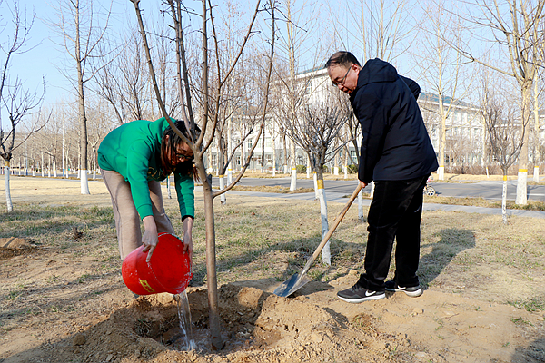 三月,草木秀润,万物复苏。植树活动中,大家分工协作、配合默契,挥锹铲土、扶树填土、最后培土、踩实,浇水。每一个步骤都一丝不苟,严谨对待,看着一棵棵树苗被栽种完成,心中的满足感不言而喻。经过大家的共同努力,这片充斥着汗水、满载着希望的树林种成。种好的树苗整齐排列发出盎然的生机。活动倡导同学们争做校园绿色植被“守护人”,为“美丽潍医”贡献力量。