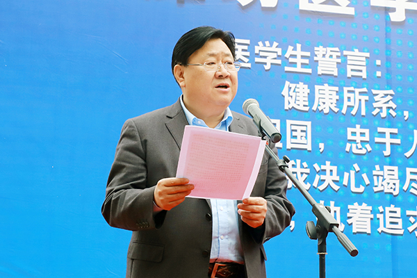 继续教育学院副院长李宪华、教师代表王伟、2017级在校生代表和2019级新生代表先后发言,全体学生重温了医学生誓言。