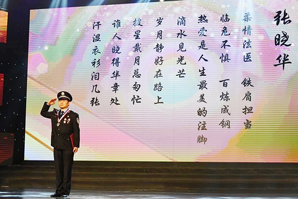 组委会给予张晓华的致敬辞:柔情法医,铁肩担当。临危不惧,百炼成钢。热爱是人生最美的注脚,滴水见光芒。岁月静好在路上,披星戴月总匆忙。谁人晓得华章处,汗湿衣衫泪几张。