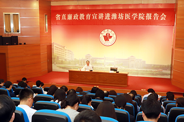 5月15日下午,省直廉政教育宣讲团到潍坊医学院进行廉政教育巡回宣讲。省直廉政教育宣讲团成员、省纪委省监委驻省委宣传部纪检监察组组长关华同志作了《以习近平新时代中国特色社会主义思想为指导 不断推动全面从严治党向纵深发展》的宣讲报告。校领导、处级领导干部、基层党组织书记、专职组织员、机关党委科级干部、全体学生辅导员等200余人参加了报告会。报告会由校纪委书记田艳玲主持。