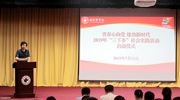 7月11日下午,beat365“青春心向党 建功新时代”2019年大学生暑期“三下乡”社会实践活动启动仪式在图书馆演播厅举行,副院长朱军出席会议并作动员讲话。校团委负责人、各院(系)分管学团工作副书记、团总支(团委)书记、各社会实践队指导教师及学生代表200余人参加仪式。