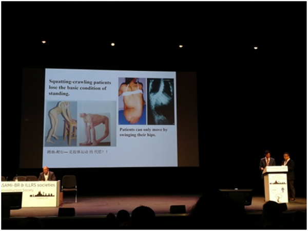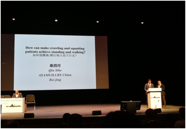 秦泗河教授的演讲题目是“如何使蹲地爬行的病人站立行走”。秦泗河教授从40年从事矫形外科经历出发,针对因小儿麻痹后遗症、脑性瘫痪、先天性多关节畸形等18种原因致使丧失站立行走的重度肢体残疾人,进行了30多年的临床实践探索与研究,从脊椎动物进化角度与婴儿直立行走的发育过程,总结出站立工程医疗设计表,通过系统运筹、应力控制、优化组合的手术方法与康复辅具结合,已经使681例丧失直立行走的重度肢体残疾者,术后获得直立行走的奇特疗效。手术方法简单、疗效可靠、医疗费低廉,且规避了发生严重手术并发症。演讲PPT采用图表、动画、手术视频展示模式,展示了15例不同年龄的术前蹲移爬行病人,术后获得直立行走对比的真实视频,一张张图片,一帧帧视频,严重的肢体畸形残疾和术后获得不可思议的优良治疗效果,形成鲜明的对比,引起与会代表不断惊奇赞叹。秦泗河教授特别强调,是中国国情、文化、疾病谱培育了中国特色医学模式——秦氏下肢重建外科技术体系。这个技术体系,能够在经济不发达的国家学习推广,可以有效改善无数重度肢体残疾人的运动功能。演讲结束时全场报以雷鸣般的掌声。