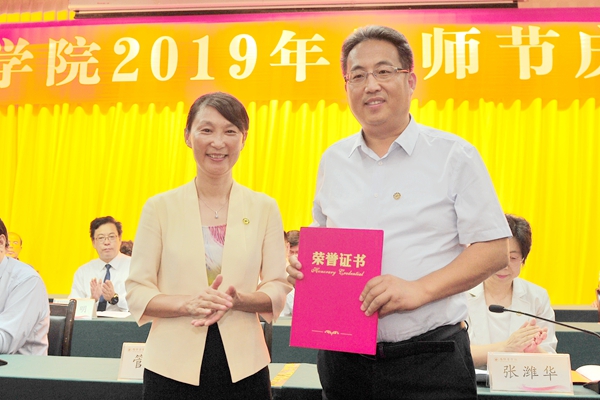| 向获得“潍坊医学院先进工作者”荣誉称号的教师代表颁发证书 |