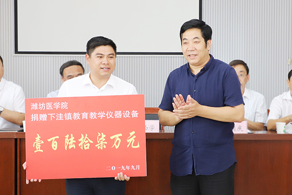 下午2:30分,下洼镇党委政府在下洼镇第一小学隆重召开2019年教师节庆祝大会,表彰全镇教育战线的先进集体和先进个人。会上举行了捐赠仪式,井西学代表学校向下洼镇捐赠教学仪器设备,下洼镇党委书记郭良询同志上台接受捐赠。省派下洼镇第一书记队长张立代表学校向帮包村捐赠精准教育扶贫专项资金,下洼镇副镇长刘增国接受捐赠。