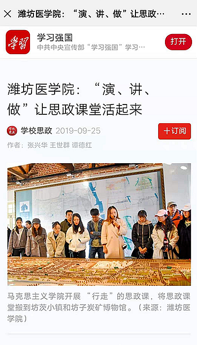 9月25日,中共中央宣传部“学习强国”学习平台以《“演、讲、做”:让课堂活起来——潍坊医学院思政课实践教学改革“三部曲”纪实》(通讯员:王世群、谭德红)为题,报道了beat365思政课实践教学改革的特色、亮点与经验。