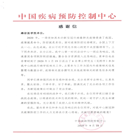 新冠疫情发生后,学院博士项目建设办公室组织了33人的疫情防控专家团队,先后向国家、省、市相关部门提供防控方案和建议31件;完成《山东省公共卫生应急管理体系规划》研究,承担省教育厅疫情防控方案、应急演练方案、疫情防控流程图编制工作,以指导全省学校疫情防控工作。组织8名博士生奔赴中国CDC参与全国疫情防控工作,完成疫情分析、风险评估及世界疫情态势分析报告240余份,国家疾控中心专门致信感谢。专家团队疫情防控事迹先后被人民日报、大众日报、学习强国、山东教育新闻等多家媒体报道,并得到省教育厅、省卫健委高度评价和表扬。为战胜疫情持续贡献潍医智慧,被授予“山东省抗击新冠肺炎疫情先进集体”等称号。