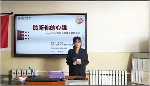姜明秀谈及参赛感受时说:我国老龄化日趋严重,心血管疾病成了一大杀手,国家这些年大力推动着康复事业的发展,正是这个契机,借此推出一款适合心脏病患者使用的APP。比赛中组员们充分沟通,与大家默契协作,互相提出项目改进建议,悉心听取指导老师给出的意见,不放过每一个细节,不断修改,争取做到尽善尽美。最重要的一点,要沉下心来,这样才能做到宁静致远。