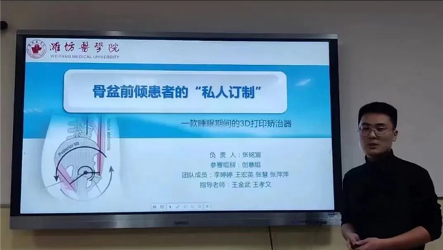 由教师邱越、高强指导的姜明秀同学负责的项目“‘聆听你的心跳’智能心脏康复管理平台”获创意组一等奖;由教师王孝文、王金武指导的张铭宸同学负责的项目“3D打印骨盆前倾矫治器”,教师王孝文、刘文博指导的李婷婷同学负责的项目“实时温控药敷贴扎”,分别获创新组一等奖。