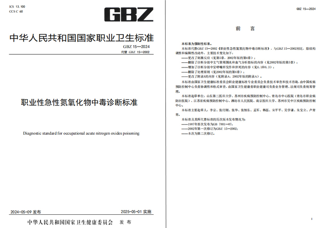 据悉,现行《职业性急性氮氧化物中毒诊断标准》2002年第一次修订。本次标准的制定从起草、修改、审定到发布历时近3年,于2025年5月1日起施行。