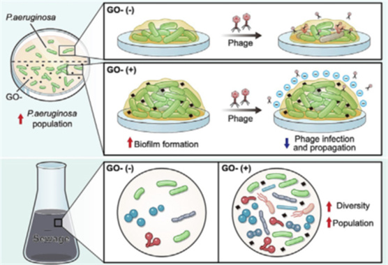 氧化石墨烯(GO)影响细菌/噬菌体互作示意图