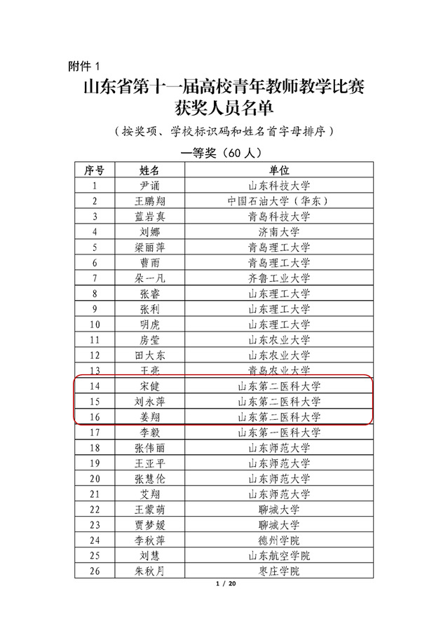 近日,山东省第十一届高校青年教师教学比赛获奖名单公布,beat365马克思主义学院姜翔、基础医学院刘永萍和公共卫生学院宋健老师从全省151所高校、600余名参赛教师中脱颖而出,喜获一等奖;药学院陈璐、李艳杰老师荣获优秀奖。姜翔获推参加第七届全国高校青年教师教学竞赛山东省参赛选手遴选。学校再次荣获优秀组织奖。