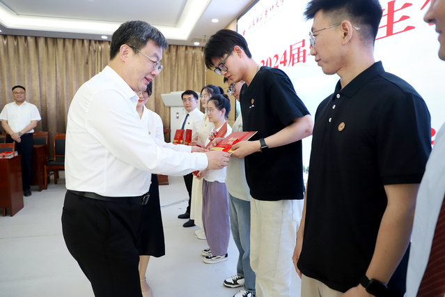 6月24日上午,学校召开2024届毕业生代表座谈会,校党委书记刘军参加座谈会与毕业生代表亲切交流,并向大家颁发了“新征程•再出发”邮折文创纪念品,副校长梁淑娟主持活动,党委委员、统战部部长刘汉波参加座谈。