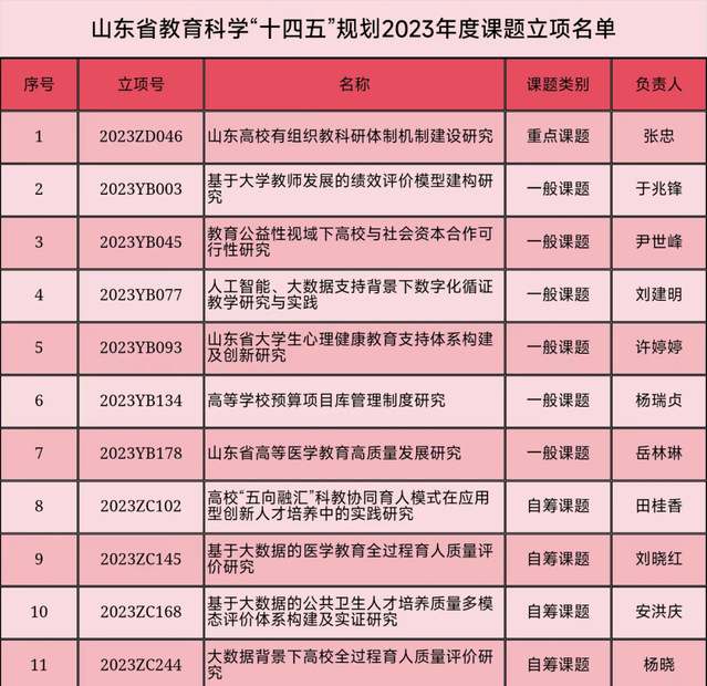 近日,山东省教育科学规划领导小组办公室公布了山东省教育科学“十四五”规划2023年度课题立项结果,beat36511项课题获得立项。其中重点课题1项,一般课题6项,自筹课题4项,立项率73.33%。立项数量位列全省高校前列。