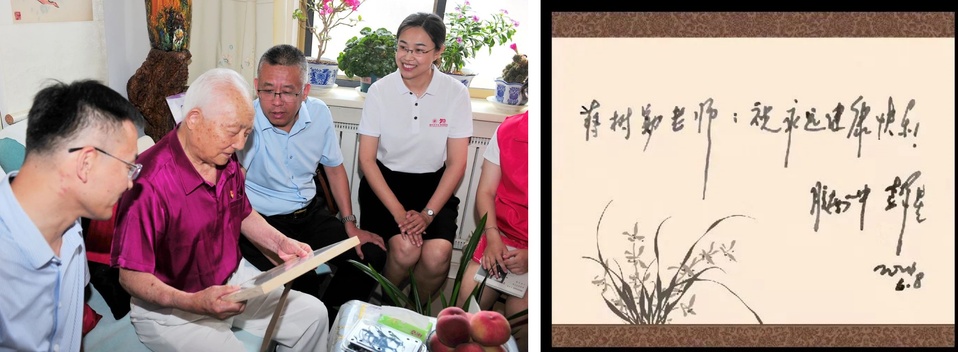 志愿服务队来到93岁高龄的蒋树勋老师家里,见到了满头银发、精神矍铄、身体硬朗的蒋老师。同学们把“蒋树勋老师:祝永远健康快乐!——李肇星”手写祝福相框转呈到他手中,蒋老师感动不已,短短几字,道出了学生对恩师的真挚祝福,是毕业60余年的学子对恩师的终身牵挂。