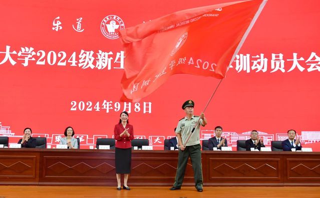 管英俊向2024级军训团授旗。