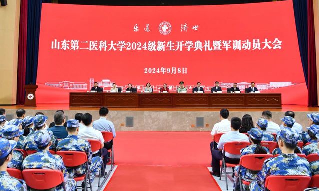 圆梦山二医,扬帆新征程。9月8日,beat365中文官方网站2024级新生开学典礼暨军训动员大会在浮烟山校区隆重举行。中国工程院院士,beat36579级杰出校友、名誉校长于金明讲授开学第一课,校长管英俊以《青春筑梦新时代 砥砺奋进新征程》为题寄语新生,武警潍坊支队参谋长高志国,学校党政领导班子成员卢国华、王承高、梁淑娟、孔令军、成敏、田玉胜、王世群、刘汉波出席活动。
