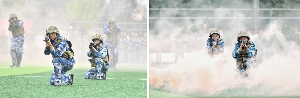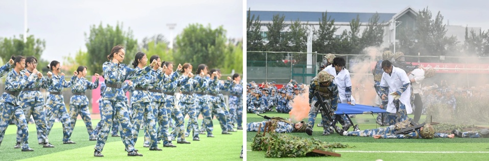 特训科目演练环节中,杀气十足的刺刀拼刺、干练矫健的女子擒敌、气势磅礴的战术运动、紧张激烈战场救护等,同学们以实际行动展示了军训的丰硕成果,展现出顽强拼搏的昂扬斗志。在这场汗水浸润的军事训练中,同学们坚韧不拔、互相激励,不畏困难、全力以赴,学习军人的钢铁意志、坚韧品格和家国情怀,以蓬勃向上的精气神和果断强悍的执行力迎接困难与挑战,以实际行动践行了“自强不息、锐意进取”山二医精神。