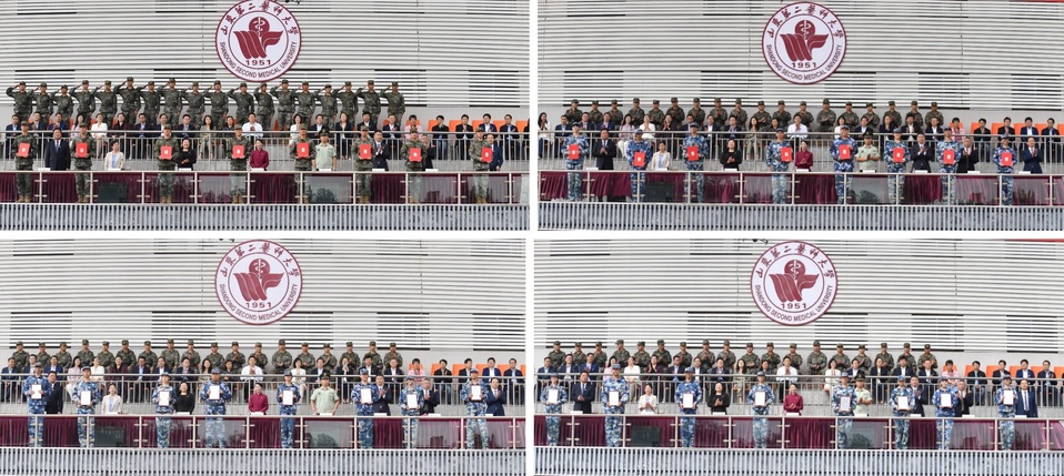 伴随着《分列式进行曲》的铿锵节奏,迎军旗、标兵就位、分列式展演正式开始,3200余名2024级新生身着戎装、目光坚毅、意气风发,喊着整齐嘹亮的口号、迈着铿锵有力的步伐,依次正步走过主席台,向山二医、向师长、向教官发出自豪的检阅邀请函。
