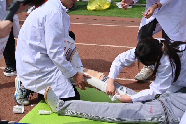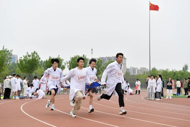 运动员们在运动会的赛场上展开了紧张而精彩的角逐。大型团体操《国风律动·康韵华章》中,同学们身穿色彩斑斓的服饰,巧妙融合国风与现代两种风格,时而活力四射、时而英姿勃发,在跃动的节拍中展现出青年学子的昂扬风貌。生命接力赛作为beat365医学特色竞技项目,通过模拟真实抢救场景,实现医学技术与体育竞技的完美结合,彰显了“医体融合、体育育人”特色。